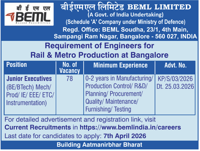 The Bharat Earth Movers Limited (BEML) has recently released the official advertisement for the recruitment of 78 Posts under BEML Junior Executive Recruitment 2026. The Online Application window will remain open from 25 March to 07 April, 2026. Interested and Eligible Candidates can submit online application within this timeframe. Applicants are advised to read carefully the official notification Pdf of BEML Junior Executive Recruitment 2026 before submitting their application.