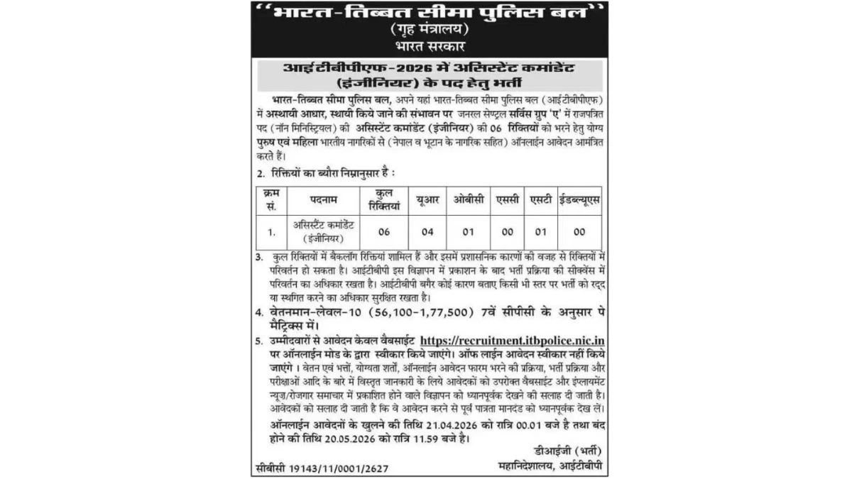 The Indo-Tibetan Border Police Force (ITBP), has recently released the official advertisement for the recruitment of 06 Posts under ITBP Assistant Commandant Recruitment 2026. The Online Application window will remain open from 21 April to 20 May, 2026. Interested and Eligible Candidates can submit online application within this timeframe. Applicants are advised to read carefully the official notification Pdf of ITBP Assistant Commandant Recruitment 2026 before submitting their application.