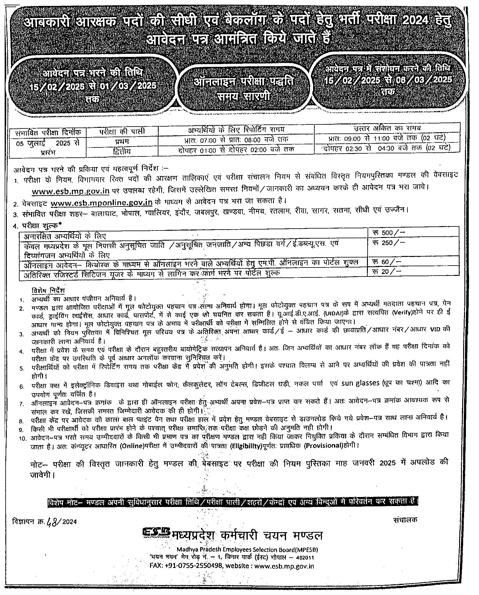 • MPESB Excise Constable Recruitment 2025 Notification has been released, all interested candidates can Apply online from 15/02/2025 to 01/03/2025.